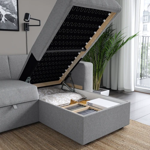 Место хранения под шезлонгом. Крышка остается открытой, чтобы вы могли безопасно и удобно извлечь свои вещи.