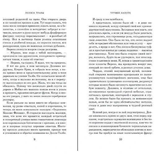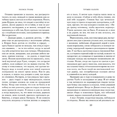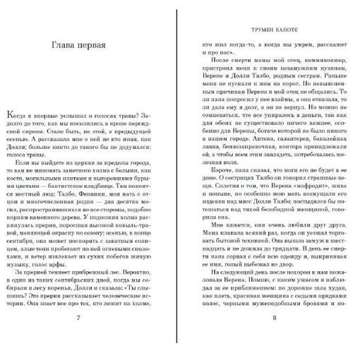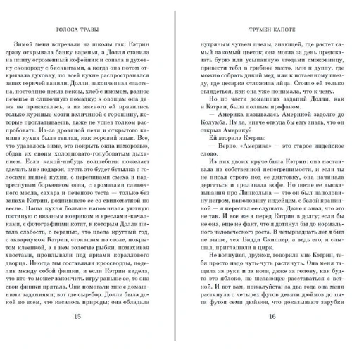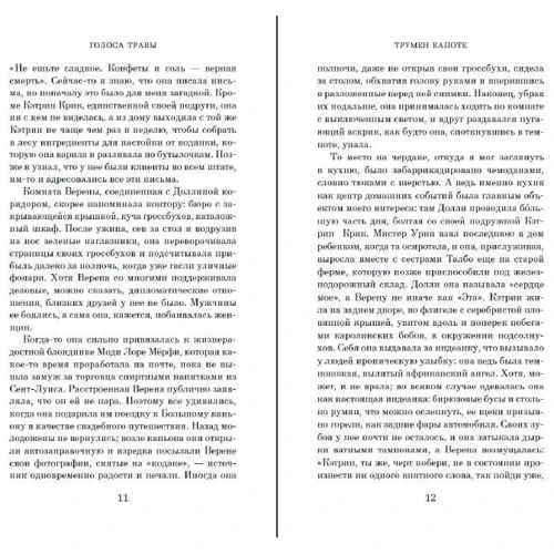 Вниманию читателя предлагаются две его классические повести: лирические «Голоса травы», публикующиеся в новом переводе, а также самое знаменитое произведение Капоте, прославленное в 1961 году экранизацией с Одри Хепберн в главной роли, сыгравшей главную героиню повести Холли Голайтли, одну из самых ярких и необычных женщин американской литературы.