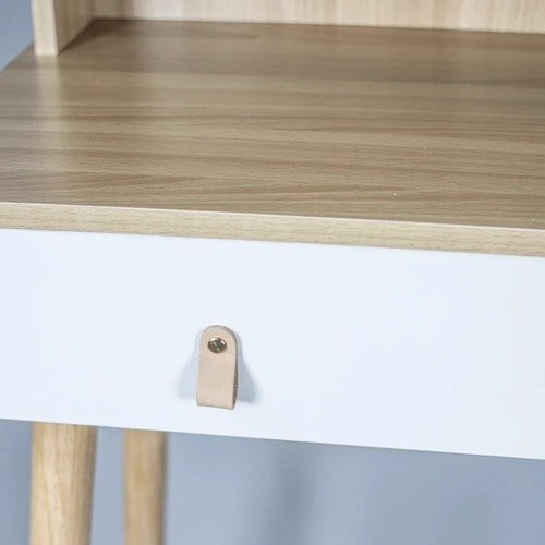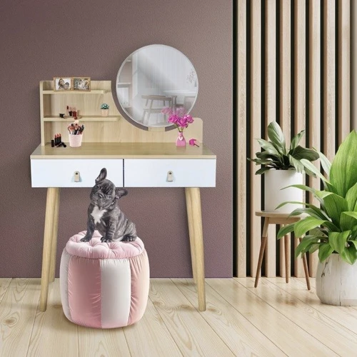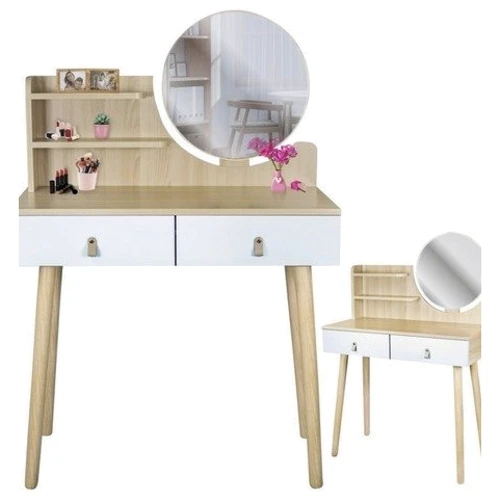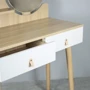 Косметичный стол Jumi SCANDI с двумя ящиками, в которые можно положить базовую косметику или другие аксессуары. Удобные полки для повседневных мелочей, таких как крем для рук, очки, духи, аксессуары для волос. Столешница дополнена встроенными выдвижными ящиками с кожаными ручками. Благодаря качественной и надежной фурнитуре, ящики открываются бесшумно.