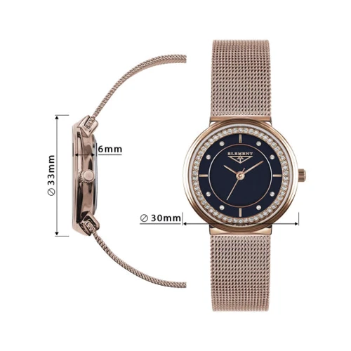 Жіночий наручний годинник 33 Element 331714 з швейцарським кварцовим механізмом. Корпус годинника виготовлений з високоякісної сталі з PVD покриттям кольору рожевого золота. Темно сірий Аналоговий циферблат прикрашений гравіюванням логотипу і камінням, які виконують функцію індексів часу. Захищений циферблат сапфіровим склом, що володіє твердістю дорогоцінного каменю і стійким до механічних пошкоджень годинник комплексується металевим браслетом з PVD покриттям кольору Рожевого зотота. Плетіння браслета Міланське, застібка метелик. Годинники відмінно підійдуть як до ділового костюма так і до вечірнього вбрання. Водозахист 3атм.