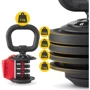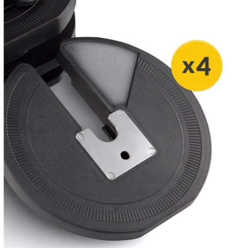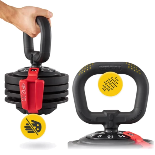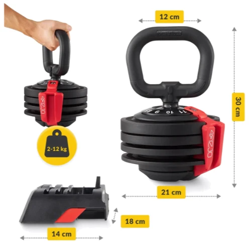 Гиря зі змінною вагою від 4FIZJO виготовлена з комбінації високоякісних матеріалів. Диски мають композитну структуру – усередині чавун, покритий кількома шарами міцного пластику. Це дає відразу кілька переваг: дозволяє вберегти покриття для підлоги від механічних пошкоджень, зменшує рівень шуму при тренуваннях і робить виріб естетично привабливим. Ергономічна форма рукоятки забезпечує надійний хват і запобігає ковзанню навіть у вологих руках. Інвентар поставляється з підставкою та оснащений інноваційною системою кріплення пластин, що дозволяє швидко змінювати навантаження під час тренування навіть однією рукою. Для цього достатньо покласти снаряд на підставку, провернути рукоятку до потрібного значення ваги, і все обладнання готове до використання.