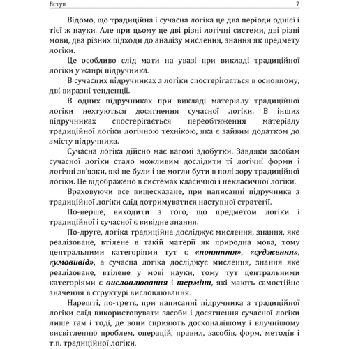 У підручнику зроблена спроба поєднати, де це доречно, матеріал традиційної логіки із досягненнями сучасної логіки. Мається на увазі, висвітлення: в темі «Поняття як форма мислення» логічної структури поняття, логічних відношень між поняттями засобами логіки предикатів; в темі «Судження як форма мислення» простих суджень, мовою логіки предикатів, складних суджень мовою логіки висловлювань; в темі «Умовивід як форма мислення» умовиводів логіки суджень засобами логіки висловлювань. Такий підхід дозволив частину матеріалу, який зазвичай в традиційній логіці висвітлювався на описовому рівні, подати у вигляді чіткої теоретичної системи.