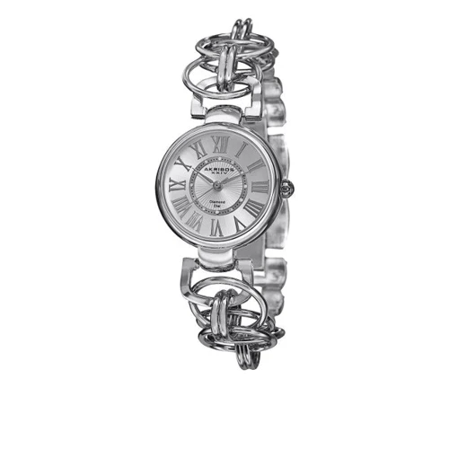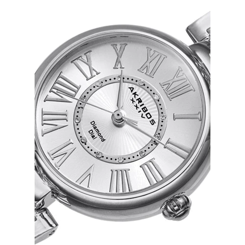 Жіночі діамантові швейцарські кварцові годинники, ланки ланцюга сріблястий браслет. Ці чарівні годинник від Akribos XXIV демонструють сонячний циферблат з римськими цифрами і 12 справжніми алмазними вартовими мітками. Кварцовий зовнішній циферблат з вигравіруваним внутрішнім циферблатом. Мінеральний кристал з сапфіровим покриттям. Брендовий коробка, оригінальні сертифіковані документи, інструкція по догляду. Для повторного запуску годинника потягніть / підштовхніть корону. Загвинтити корпус назад.