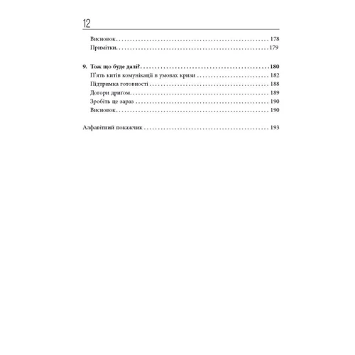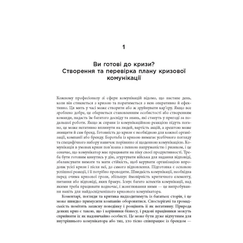 Цінні поради, наведені результати досліджень і велика кількість конкретних прикладів стануть справжнім ресурсом у повсякденній діяльності професійного комунікатора до настання кризи і на будь-якому її етапі. А продумане планування, своєчасне реагування та постійна увага до людей допоможуть захистити бізнес, зробивши його міцним і стійким до будь-яких викликів.