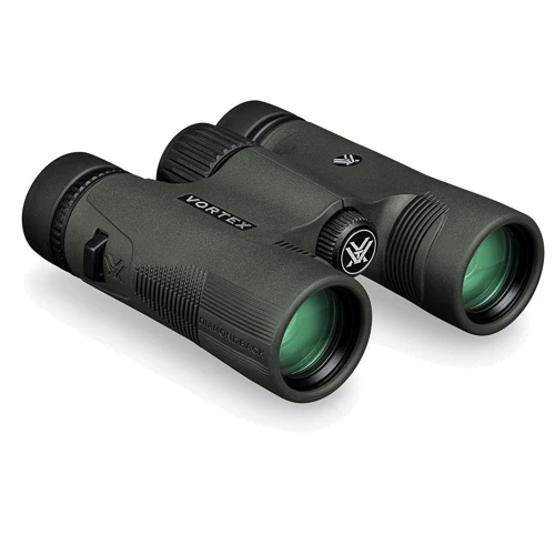 Нове покоління самої популярної лінійки біноклів Vortex Diamondback HD - це покоління з високою роздільною здатністю зображення. Сучасна HD-оптика дозволяє мінімізувати спотворення і досягти реалістичного зображення. Призми з високоякісного скла BAK4 з фазовою корекцією і діелектричним покриттям сприяють приголомшливою деталізації. Продуктивність біноклів Vortex Diamondback HD значно переважає над їх вартістю. Вдалий дизайн біноклів залишився без змін. Легкий ергономічний корпус бінокля має сучасний дизайн, оснащений захисним гумовим покриттям, водонепроникний і заповнений аргоном, що запобігає запотівання оптики при різких змінах температури. Корпус біноклів компактний, легкий, а головне зручний для захоплення пальцями рук. Мінімальна дистанція фокусування бінокля настільки хороша, що дозволяє буквально спостерігати навіть те, що відбувається на відстані півтора метрів. Можна без сумнівів сказати, що ці біноклі значно перевершують конкурентів в своєму класі.