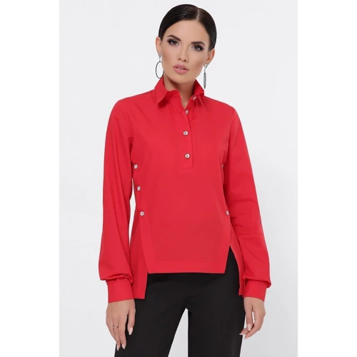Червона асиметрична блуза з розрізами з боків, які застібаються. Жіноча модель вільного крою з фігурною передньою поличкою, застібається на чотири гудзики зверху. Блуза одягається через голову.
