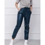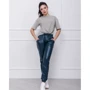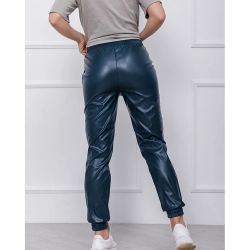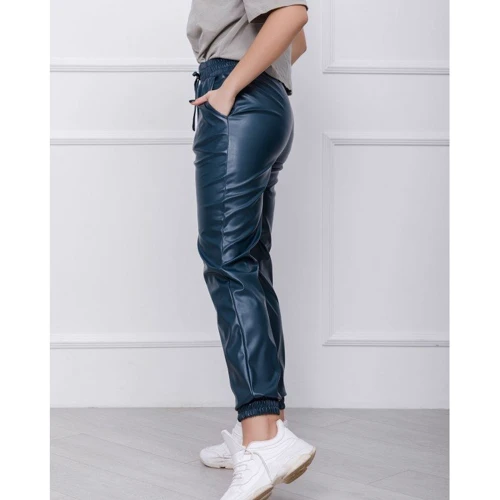 Молодіжні брюки джоггери виконані з м'якої еко-шкіри. Виріб вільного прямого крою з нижніми гумками на манжетах. Модель високої посадки з широкою поясною гумкою на тасьмі оснащені бічними кишенями.