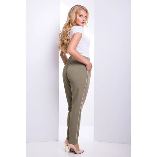 Стильні жіночі штани Бенефіс володіють комфортним, злегка завужені донизу кроєм. З боків вироби вставки з тасьми з дрібним металевим декором. Модель оформлена широким притачним поясом, в спинку якого вшита еластична гумка. Як застібки використані два гудзики і блискавка. Передбачені прорізні кишені з двох сторін.