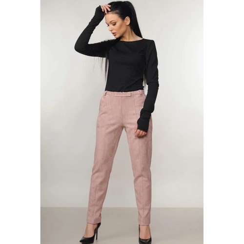 Чудові напівприлеглі завужені до низу штани з класичними боковими кишенями, довжиною 7/8, завищеною лінією талії і пришивним нешироким поясом зі шлевками - поєднують в собі елегантність ділового стилю з оригінальністю тканини глибокого соковитого кольору. Додатковим сміливим акцентом є прошиті спереду стрілки і неординарна застібка на потаємну блискавку, яка по лінії пояса прикривається хлястиком.