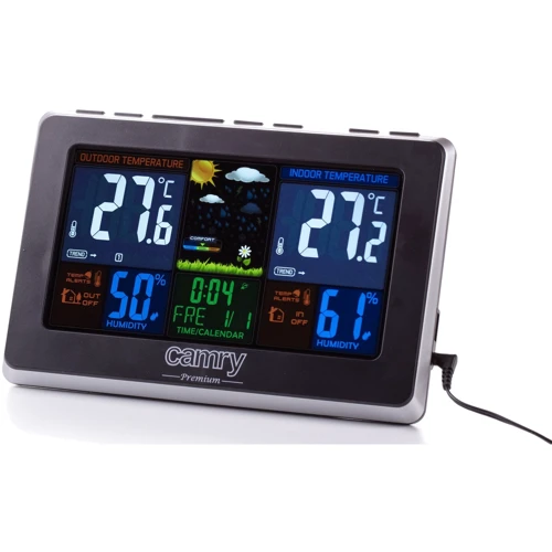 Метеостанція Camry CR 1174 оснащена датчиком, який дозволяє вимірювати зовнішню та внутрішню температуру. Температура відображається у градусах Цельсія та Фаренгейта. Крім того, станція також відображає рівень зовнішньої і внутрішньої вологості, який оцінить будь-який алергією, що страждає. Кольоровий екран показує комфортний рівень вологості.