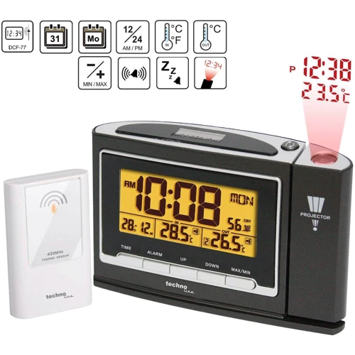 Проекційний годинник Technoline WT529 являє собою компактну температурну станцію з виносним радіодатчиком і можливість відображення поточних, мінімальних та максимальних значень температури. Значною перевагою даної моделі проекційного годинника є фокусування проекції та автоматичне включення нічного підсвічувального режиму дисплея. Technoline WT529 має коліщатко для регулювання чіткості проекції, таким чином, практично на будь-якій відстані у квартирі чи будинку всі символи проекції будуть максимально чіткими. Сенсор освітленості автоматично визначає низький рівень освітлення в приміщенні і включає ледве помітне нічне підсвічування дисплея, яке дозволяє бачити показання годинника вночі, проте не дратує. Кнопка перевороту зображення проекції на 180 градусів дозволяє розгорнути проекцію без пересування годинника.