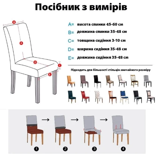 Ці чохли виготовлені з високоеластичних тканин, склад яких на 95% складається з поліестеру і на 5% зі спандексу. Їхня пружність і майстерність виробництва гарантують найбільше прилягання до більшості стільців.