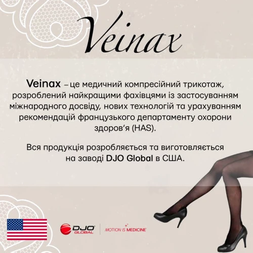 Veinax – це медичний компресійний трикотаж, розроблений найкращими фахівцями із застосуванням міжнародного досвіду, нових технологій та врахування рекомендацій французького департаменту охорони здоров'я (HAS).