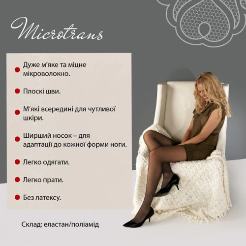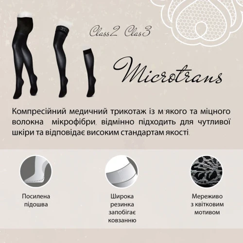 Носіння компресійних панчох Microtrans (мікрофібра) 2 клас компресії полегшує больові відчуття, сприяє зняттю набряків, запобігає глибокому тромбозу вен та іншим серйозним розладам. Комфортні, м'які та легкі медичні компресійні панчохи відмінно підходять для чоловіків та жінок.