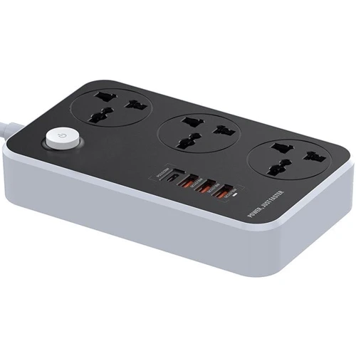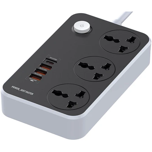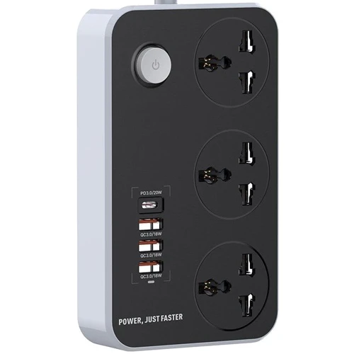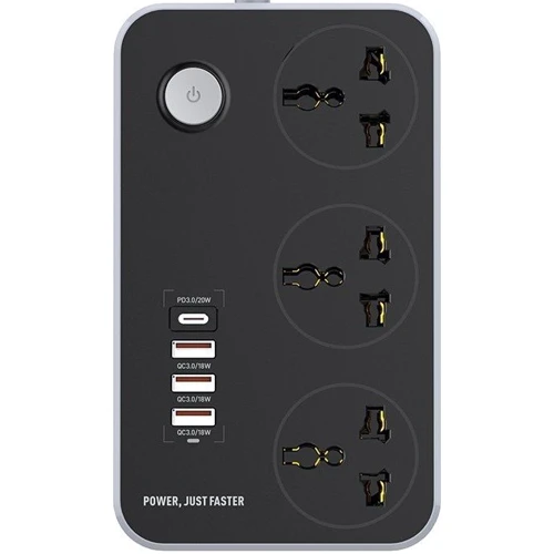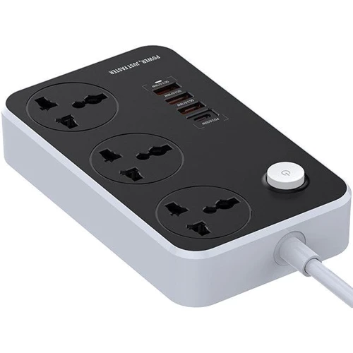 Компактний подовжувач із трьома універсальними мережевими розетками, оснащеними захисними шторками за технологією Child Security Door. Автоматичне балансування навантаження (до 36W) на всі USB порти: три USB порти з підтримкою технології швидкої зарядки Quick Charge 3.0, порт USB-C PD з підтримкою Apple - fast charging.