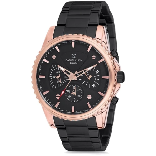 Чоловічі кварцові годинники. Корпус виготовлений з латуні, браслет - з нержавіючої сталі. Годинники з чорним і рожевим PVD покриттям. На чорному циферблаті розташовані вартові мітки, дата, день тижня і додатковий показник часу в 24-х годинному форматі. Скло - мінеральне, стійке до виникнення подряпин. Водонепроникність - 50 м, що є посиленою бризгозахист корпусу.