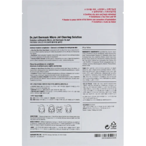 Dr. Jart + Dermask Clearing Solution Ultra-Fine Microfiber Face Sheet Mask - ефективний очищающий «агент». Продукт виготовлений з високоякісної мікрофібри, яка щільно прилягає до обличчя, не викликаючи при цьому дискомфорту. М'яка тканина просочена спеціальною сироваткою, збагаченою потужними антиоксидантами, саліцилової кислотою і екстрактом чайного дерево. Комплексна дія цих компонентів здатна помітно поліпшити стан текстури і вирівняти тон шкіри.