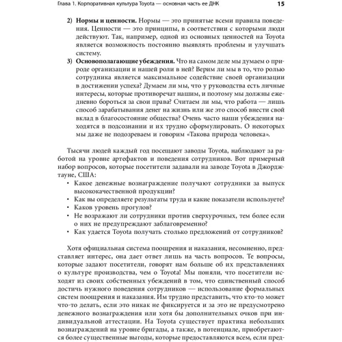 Впровадження бережливого виробництва часто закінчується невдачею тому, що цю систему сприймають як механістичну, як набір процедур і технологій. Автори книги показують, що ключ до успіху Toyota - в особливому ставленні до людей, в поєднанні найвищих вимог керівництва і поваги до кожного співробітника. Таку культуру не можна прищепити за пару тренінгів, а без особливої культури бережливе виробництво побудувати неможливо. У книзі вперше описуються основні елементи корпоративної культури Toyota - її головного "секретної зброї". Книга допоможе навчитися адаптувати культуру Toyota до потреб своєї компанії, зберігаючи її головну основу - прагнення до досконалості.