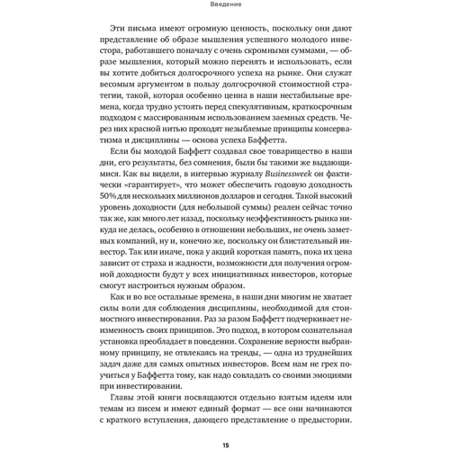 Інвестиційного гуру Уоррена Баффета багато хто називає "провидцем". Сам Баффетт говорить, що передбачати поведінку ринку безглуздо і тільки терпіння, ощадливість і вірність принципам допоможуть досягти довгострокового успіху. Такого прагматичного підходу він дотримується з моменту організації свого першого товариства Buffett Partnership Limited (BPL) в 1956 р. Саме тоді молодий Баффетт почав раз в півріччя надсилати партнерам листи, в яких розповідав про результати роботи і детально пояснював свої методи інвестування. Баффетт не пише книг, але його листи партнерам, зібрані в цьому виданні, дають можливість зрозуміти образ думок і філософію інвестування великого підприємця.