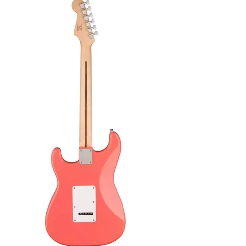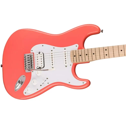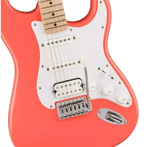 Основні особливості електрогітари Squier by Fender Sonic Stratocaster HSS MN Tahity Coral: Тонкий та легкий корпус з тополі; "С"-подібний гриф із клена; Звукоздымачі: Ceramic Humbucker бридж, Ceramic Single-Coil дек і мідл; 6-сідельний Vintage-Style Synchronized Tremolo бридж; Хромована фурнітура; Колір – кораловий.
