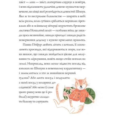 Якщо вам подобаються книжки, в яких не надто багато бурхливих подій, книжки, в яких коти і люди влаштовують біля річки пікнік з булочками та морквяними мечами, книжки з грою слів, римами і довгими списками — ви обрали те, що треба. І не біда, якщо у вас під рукою немає підхожої скатертини. Панна Птіфур упевнена: чудові пригоди можна пережити, просто глянувши в обличчя дорогої твоєму серцю людини.