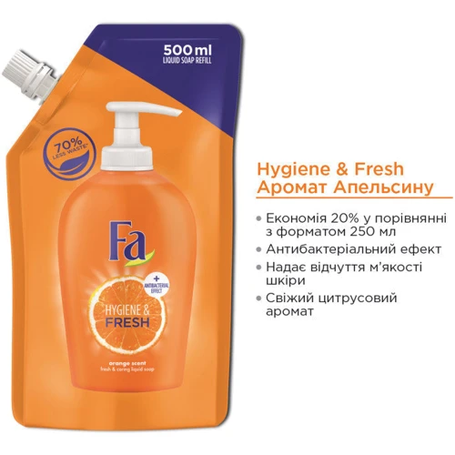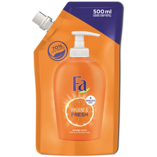 Рідке мило бренду Fa - це простий рецепт чистоти і ніжності. Завдяки антибактеріальним компонентам засіб ефективно справляється з усіма забрудненнями і ретельно видаляє бактерії, які можуть нашкодити організму. Але збалансований склад також дозволяє забезпечити шкірі делікатний догляд, тому після застосування гігієнічного засобу вона буде м'якою і шовковистою, адже воно інтенсивно зволожує. Забудьте про дискомфортних сухості і стягнутості! Відтепер тільки чистота, свіжість, м'якість і освіжаючий апельсиновий аромат. # Особливості Hygiene & Fresh Orange Scent Soap від бренду Fa: