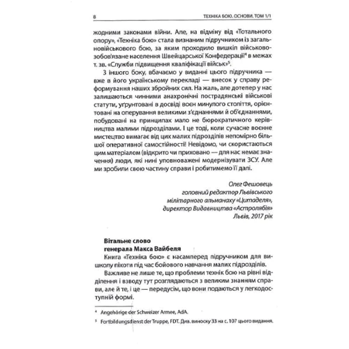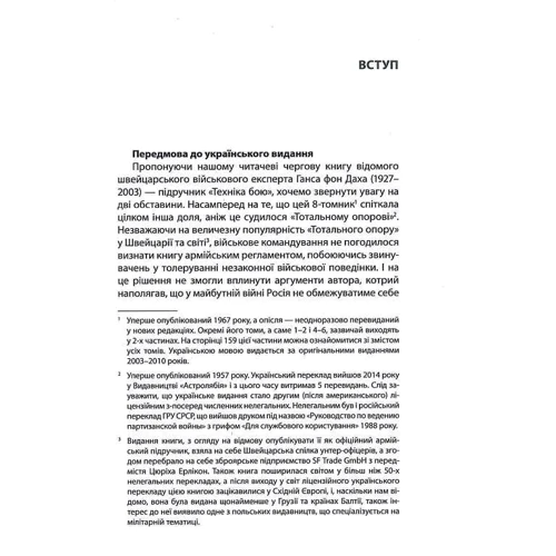 Фундаментальний швейцарський підручник з основ загальновійськового бою від автора «Тотального опору». У ньому детально і доступно описано техніки сучасного бою і командування військовими підрозділами, розвідки і диверсійної роботи, особливості застосування зброї, будування фортифікаційних споруд та інженерних загороджень, правила організації маршу та розквартирування, постачання війська, санітарної служби, військового вишколу тощо.