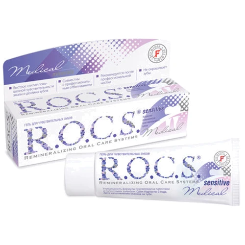 Гель для чутливих зубів R.O.C.S. Medical Sensitive дозволяє швидко зняти больові симптоми / запобігти їх виникненню та одночасно здійснити ремінералізацію твердих тканин зубів (емалі та дентину).
