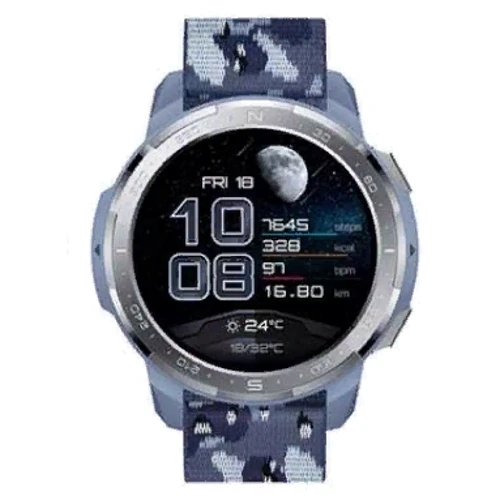 Корпус Honor Watch синього кольору. Ремінець виконаний з силікону в сіро-блакитному камуфляжному забарвленні. Зовнішні габарити складають 48х48х13,6 мм, а вага з ремінцем — 45 м Смарт-годинник не відчувається на руці за рахунок тактильно приємних матеріалів і невеликої ваги. Такий пристрій може стати відмінним подарунком для любителів різних активностей.