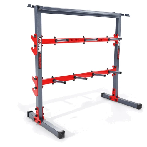 У верхній частині обладнання є полиця для зберігання гантелей. Його витривалість до 150 кг, тому ви можете зберігати на ньому весь комплект обтяжувачів одночасно, не побоюючись пошкодити обладнання. Мінімальний внутрішній розмір гантелі – 12 см, максимальний – 18 см.