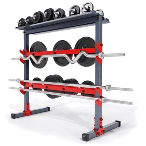 Високоякісна стійка для обтяжень, яка допоможе тримати домашній спортзал у порядку. Сім перекладин для підвішування обтяжень, полиця для гантелі та спеціально розроблені гачки, щоб утримувати до чотирьох грифів.