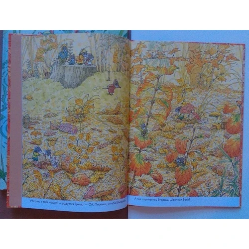 Сімейство мишенят грає в хованки в яскравому осінньому лісі - легко сховатися під листям, за пеньками, між гілок. Але ось всі знайшлися, а де ж Шестік? У пошуках малюка мишки заходять все глибше в ліс і стають свідками приголомшливого видовища - осіннього параду різнокольорових грибів, плодів, ягід. Назви і замальовки різних видів грибів можна знайти на форзацах книги, і вже самим відправитися на пошуки грибних скарбів в ліс!