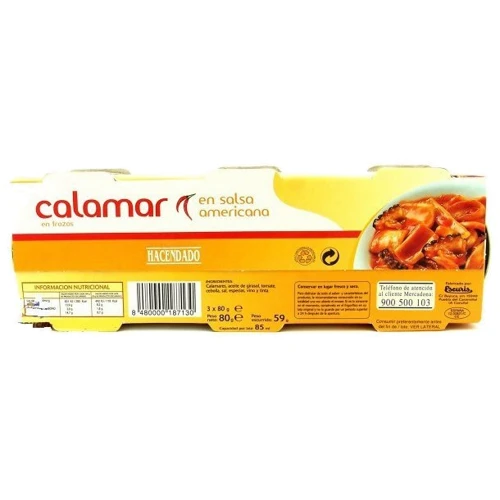 До складу м'яса Calamar en en salsa americanaвходят речовини, які сприяють поліпшенню травлення. За вмістом білка, вітамінів В6, РР і вітаміну С, м'ясо кальмара перевершує рибу, яловичину і свинину.
