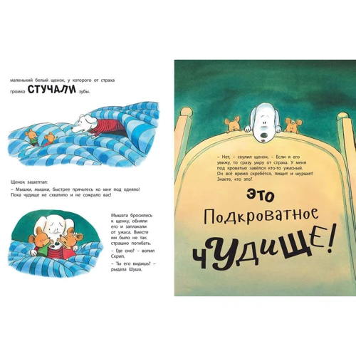 Чудовиська бувають різні. Ось одінй мишачій сім'ї довелося зустрітися з Наліжковим чудовиськом - воно сопіл, пихкало і ворушилося під ковдрою. А одному маленькому цуценяті - з не менш жахливим Підліжковим чудовиськом - воно шкребло, пищало і шаруділо під ліжком…