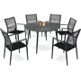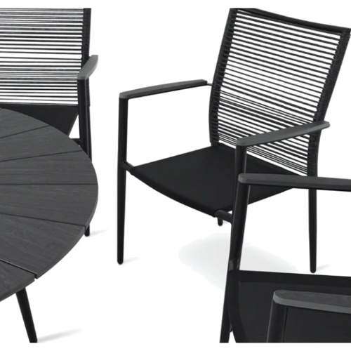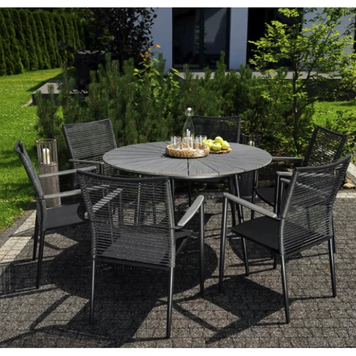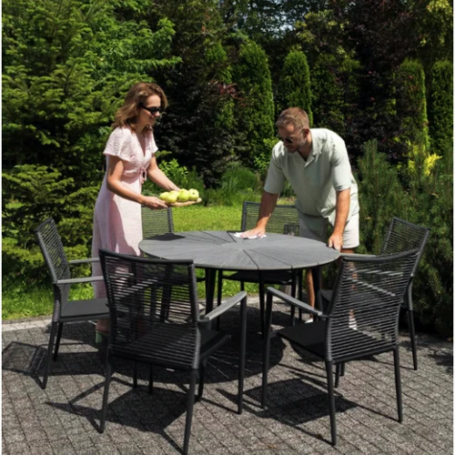 Arona - практичний та елегантний набір садових та терасних меблів. Круглий стіл та шість зручних крісел з підлокітниками ідеально підходять як для повсякденного проведення часу на свіжому повітрі, так і для барбекю та сімейних вечерь. Садові меблі Arona відрізняються сучасним дизайном і високоякісними матеріалами, завдяки яким стіл і стільці набувають естетичного вигляду і стійкості до вологи і погодних умов, що змінюються, в тому числі: дощ, УФ-промені або високі або низькі температури. Мінімалістичний стиль меблів, заснований на простоті форм та кольорів, обмежених класичним чорним та модними відтінками сірого, дозволяє вдало вписатися у будь-яке оформлення простору, як класичне, так і сучасне.