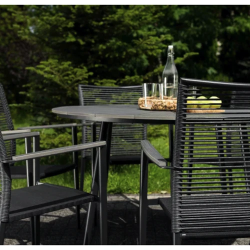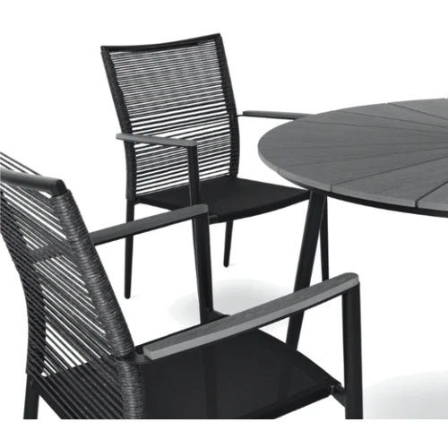 Стільці в наборі Arona міцні, стійкі та зручні. Алюмінієва рама, пофарбована в чорний матовий відтінок, надає стільцям елегантного вигляду та легкості, завдяки чому меблі легко переставлятимуть та адаптують їхнє розташування до поточних потреб. Комфортні підлокітники із сірої фанери створюють виразний матеріал та колірний упор. Спинки та сидіння з техноротангу та текстилену забезпечують комфорт під час сидіння. Це гнучкі матеріали, які підлаштовуються під форму тіла та фігуру та водночас стійкі до деформації. Завдяки використанню техноротангу та текстилену стільці не псуються і не вицвітають навіть під час дощу, снігу або тривалої дії УФ-променів.