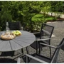 Функціональний великий садовий стіл із круглою стільницею забезпечує достатньо місця для шести осіб. Міцна, але легка алюмінієва конструкція з тонкими ніжками та міцною стільницею з поліетилену гарантують стійкість столу до корозії та шкідливого впливу атмосферних факторів, завдяки чому меблі зберігають свою естетичність протягом багатьох років використання. Стільниця виготовлена з концентрично складених панелей, які точно імітують структуру та зовнішній вигляд натуральної деревини, але на відміну від неї не вимагають сезонного догляду та легко утримуються в чистоті, оскільки її поверхня не вбирає бруд. Ніжки столу оснащені практичним регулюванням висоти, що дозволяє стійко розташовувати стіл і точно вирівнювати його на нерівних поверхнях.