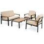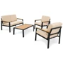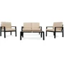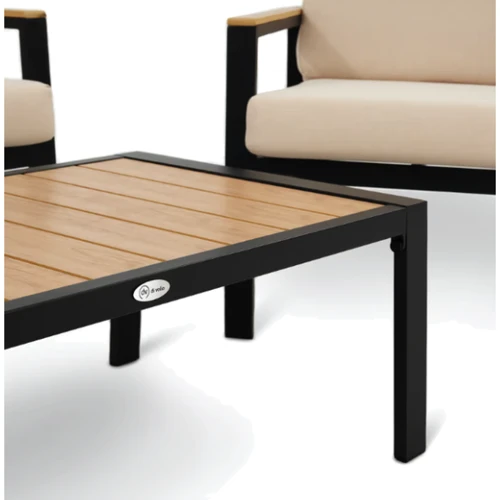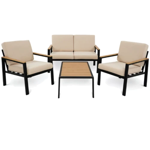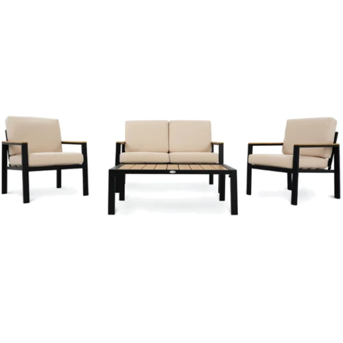 Набір елегантних та функціональних садових меблів Merano від Di Volio - гарантія успішного відпочинку на природі. Меблі для балкона, тераси, дачі є мінімалістичним сучасним дизайном, заснованим на простих геометричних формах і приглушених кольорах. Цей стиль надає меблям універсального характеру і добре підходить до будь-якого інтер'єру. У комплекті двомісний диван, два крісла з широкими зручними сидіннями та журнальний столик. Стійкі до різних погодних умов матеріали - алюмінієвий каркас з порошковим фарбуванням та поливуд, що імітує дерево, забезпечують довговічність та зберігають естетичний вигляд меблів протягом багатьох років використання. Комплект доповнений бежевими подушками.