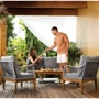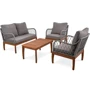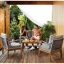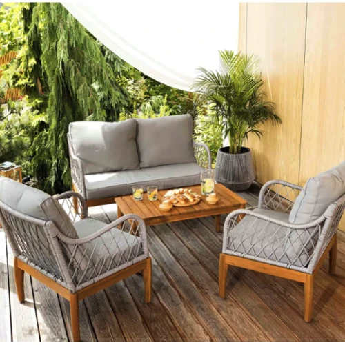 Комплект садових меблів Ragio від Di Volio - це акуратний чотиримісний набір, завдяки якому ви створите комфортне та елегантне місце для відпочинку на природі у своєму саду або на терасі. У комплект входить двомісний диван та два крісла з м'якими подушками на сидіннях та спинках, дерев'яний журнальний столик. Меблі були ретельно розроблені і виготовлені з високоякісних матеріалів, що забезпечує не тільки естетичний вигляд, але й довговічність та функціональність. Конструкція меблів поєднує в собі стійкий до корозії сталевий каркас із порошковим покриттям та міцний та стійкий до погодних умов поліпропіленовий шнур, з якого вручну сплетені спинки та підлокітники дивана та крісел. Стильний дизайн доповнені елементами з масиву акації.