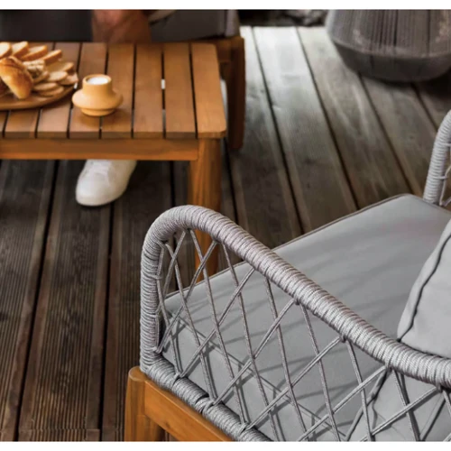 В основі дизайну садових меблів Ragio лежить гармонійне поєднання сучасних матеріалів та натуральної деревини акації. Спинки та підлокітники крісел та диванів сплетені вручну з товстого міцного поліпропіленового шнура сірого кольору, що гарантує ретельну роботу та увагу до деталей. Ажурна форма тасьми та її рівномірний візерунок надають меблям легкої форми і виглядають дуже ефектно. Елементи з промасленого дерева акації порушують простоту та сучасний стиль меблів, надаючи тепло та природний характер.