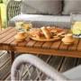 Прямокутний журнальний столик вдало розмістить закуски, напої та аксесуари, що супроводжують повноцінний відпочинок у садку. Меблі виготовлені повністю з масиву деревини акації, яка характеризується красивим, теплим відтінком, високою твердістю та стійкістю до грибків та комах. Завдяки цим властивостям деревина акації є чудовою сировиною для виробництва вуличних меблів. Стіл змащений маслом, яке захищає деревину від погодних умов і підкреслює її природну красу.