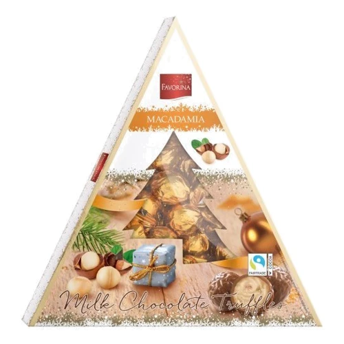 Pralines Christmas tree Macadamia від Favorina - молочний шоколад з начинкою з горіхів макадамії та карамелізованих шматочків горіхів макадамії. Коробка шоколаду прекрасна як доповнення до різдвяних подарунків.