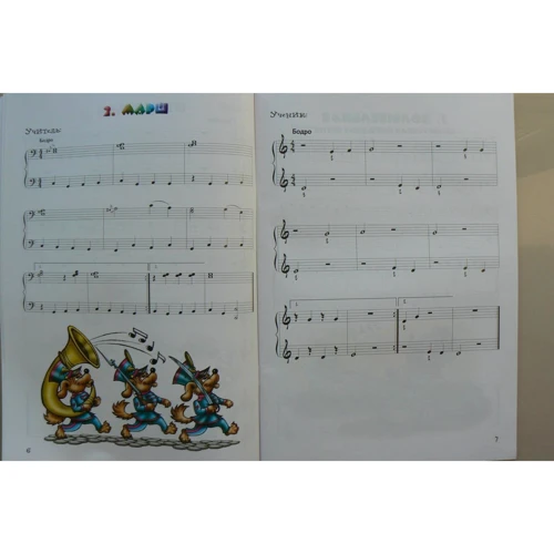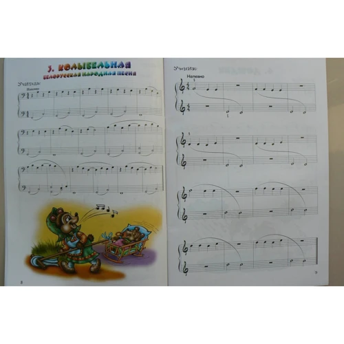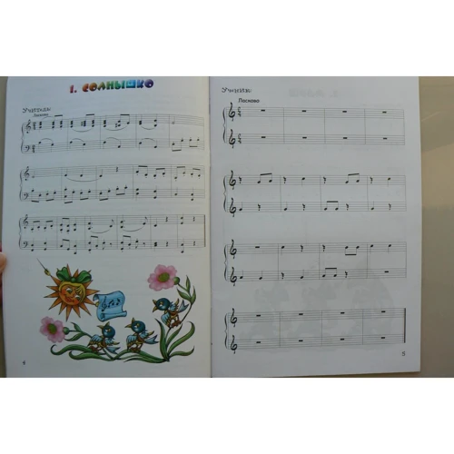 Нотний матеріал збудований від простого до складного. Партія вчителя є обов'язковою для виконання, тому що не тільки служить гармонійним доповненням до мелодії, а й несе на собі значну частину образного змісту. Її можуть виконувати як батьки, так і більш старші учні.