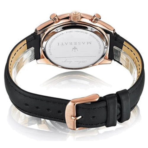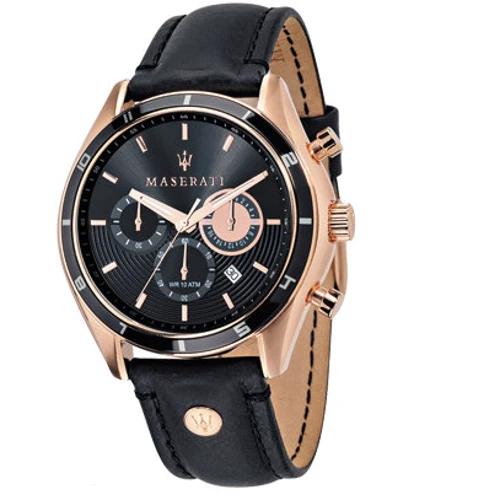 Чоловічий наручний годинник MASERATI R8871624001 на чорному шкіряному ремінці з хронографом. Механізм багатофункціональний кварцовий.