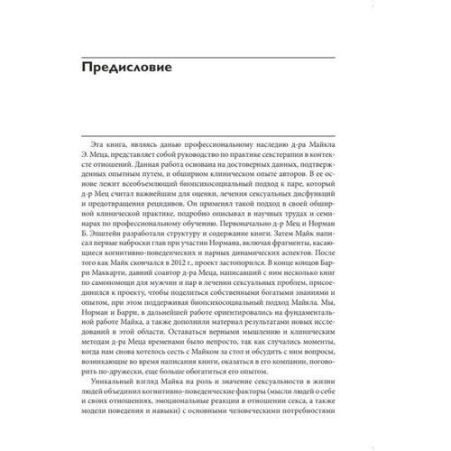 Це найповніше видання, що описує когнітивно-поведінковий підхід для роботи з парою до оцінки, лікування та запобігання рецидивам сексуальної дисфункції. Основна увага приділяється сексуальному потягу та задоволенню з упором на модель "досить хорошого сексу", взаємообмін сексуальним задоволенням, а не індивідуальний тест на досконалість. Книжка є вкладом Майкла Е. Меца в область парної секстерапії.