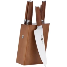 універсальний / кухонний: 1 (13 см); кухарський: 1 (20 см); для хліба: 1 (20 см); для видалення м'яса з кістки: 1 (16 см); для овочів / для чищення: 1 (8 см); підставка / дошка: дерево; ножиці: 1;