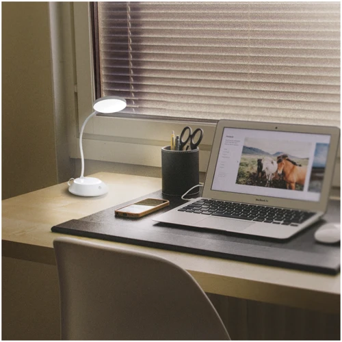Працює від двох акумуляторів (входить до комплекту) Li-Ion3.7V 1200mAh протягом 2,5 годин. Конструкція дозволяє складати лампу навпіл, економить робоче місце вдень та зручна для експлуатації та транспортування. За допомогою рухомого кріплення ви легко зможете змінити кут освітлення. Кут розсіювання світла у цій настільній лампі становить 120°. Настільна лампа висвітлює без мерехтіння, знижуючи навантаження на зір. Жодного ультрафіолетового та інфрачервоного випромінювання немає. Кнопка дозволяє вручну налаштувати яскравість світла (тривале натискання > 2сек.). За допомогою підсвічування можна вибрати оптимальну потужність світла у будь-який проміжок часу.