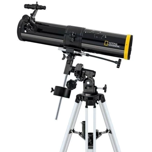 National Geographic 76/700 Reflektor EQ - класичний дзеркальний телескоп, який пропонує всі переваги рефлектора системи Ньютона. Його дзеркальний об'єктив будує зображення, повністю вільне від хроматичної аберації (колірного фарбування) - нестачі, властивого телескопів інших оптичним систем. Якісна оптика цього телескопа гарантує захоплюючі види місячної поверхні, Сатурна і його кілець, Юпітера з його світлими і темними поясами і системою супутників, сотень яскравих галактик, туманностей і скупчень. Телескоп установлений на екваторіальному монтуванні, яка істотно полегшує спостереження за зоряним небом.