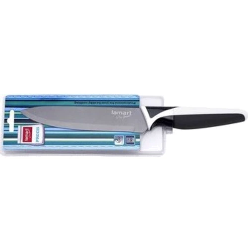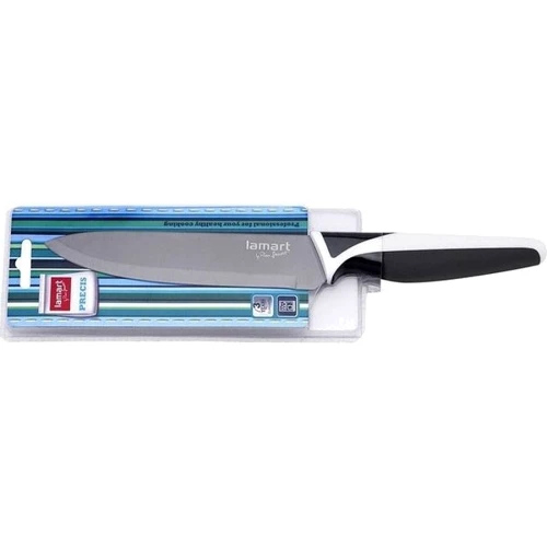 Універсальний ніж Lamart LT 2034 з титановим покриттям має дуже гостре ріжуче лезо з титанової поверхнею "Titanium" і ергономічну двобарвне пом'якшену рукоятку для максимальної зручності і безпеки. Матеріал ручки "TPR" - ультрасучасний екологічно чистий матеріал класу полімерів. Цей матеріал володіє кращими властивостями пластиків і гум: гігієнічний, м'який, гнучкий, міцний, що не пористий, безпечний і чистий. Має підвищену зносостійкість.