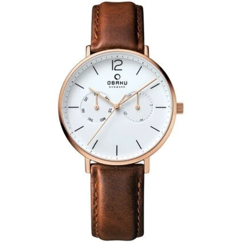 Класичний чоловічий годинник від Данського виробника Obaku має надійний кварцовий механізм. Корпус виготовлений із нержавіючої сталі з повним PVD покриттям кольору рожевого золота. На білому циферблаті розташовані арабські цифри, індекси, дата та день тижня. Скло мінеральне, стійке до виникнення подряпин. Коричневий ремінець виготовлений із натуральної шкіри та має класичну застібку – пряжку. Водонепроникність – 50 м з легкістю зможе захистити Ваш годинник від дощу або випадкового попадання води.